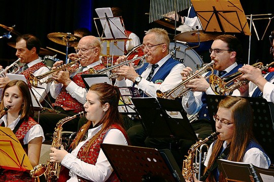 Bei den sechs gemeinsamen Stücken standen und saßen knapp 100 Musiker auf der Bühne. Die Klangstärke war da körperlich auszumachen, besonders bei den Märschen, die nach wie vor die Filetstücke der Blasmusik sind. Das zeigte eingangs der "Des Großen Kurfürsten Reitermarsch" mit seinem bedächtig schreitenden Takt, auf den sich eine nach und nach prächtig werdende Klangfülle aufbaut. Beim finalen "Bozener Bergsteigermarsch", der auch "Südtirollied" heißt und als inoffizielle Hymne des Landes gilt, durfte der mitreißende Schwung ein weiteres Mal genossen werden.