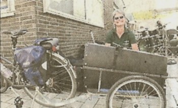 Blasorchesters, beides miteinander und radelt, das Instrument im Anhänger, zum